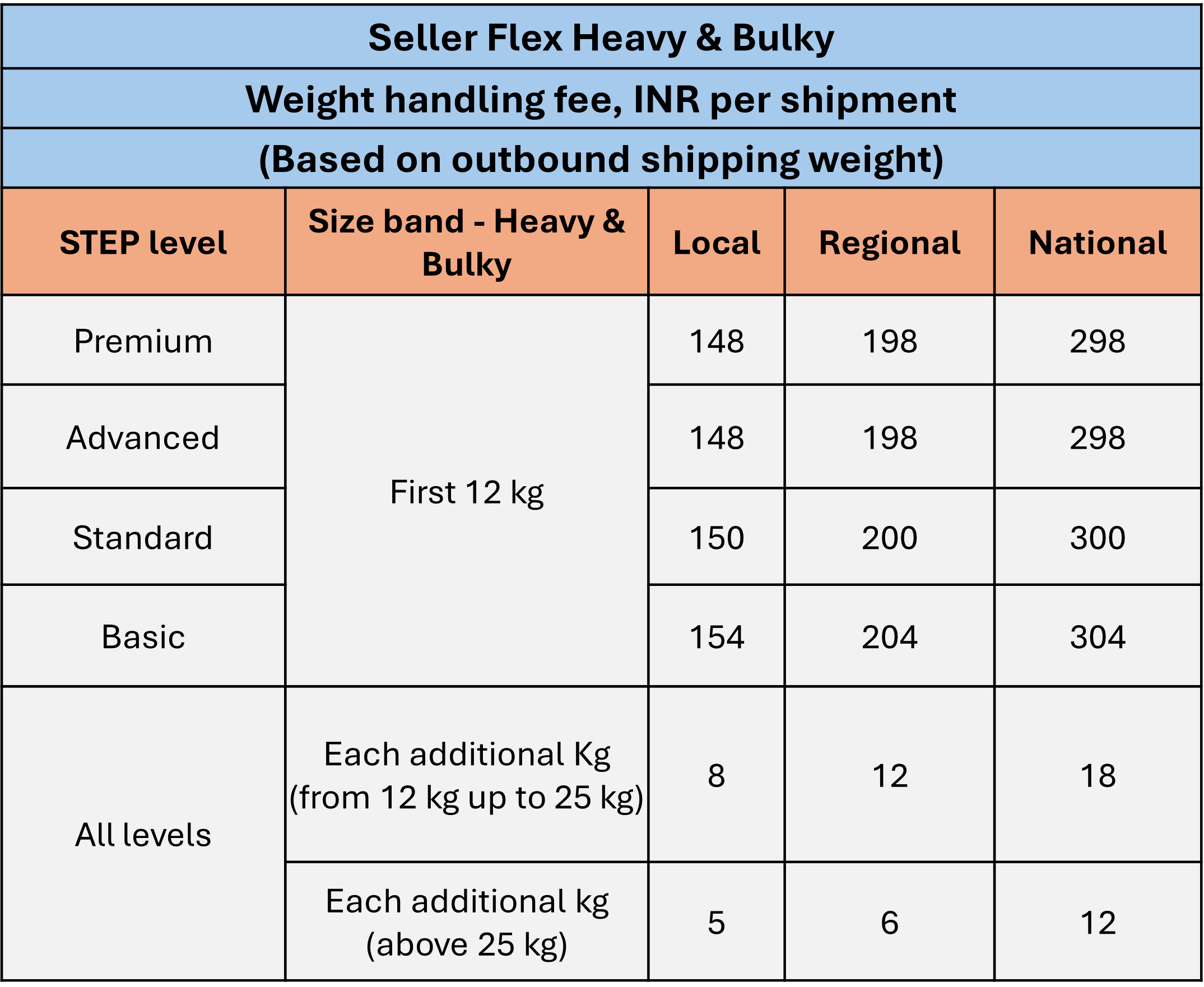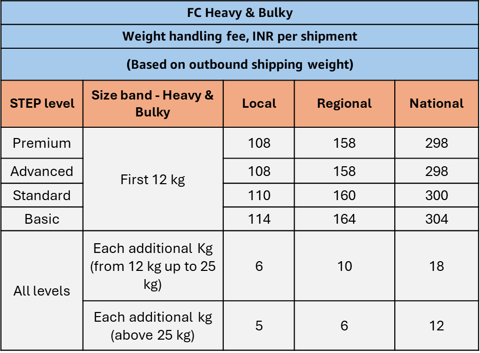 Heavy and Bulky items up to 12kg are charged at ₹26, with ₹5 for each additional 5kg thereafter.